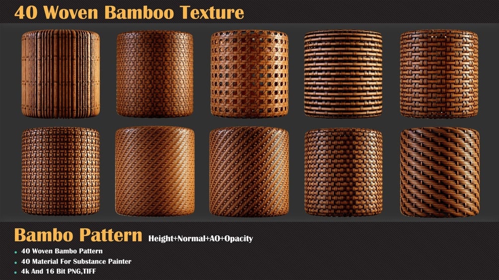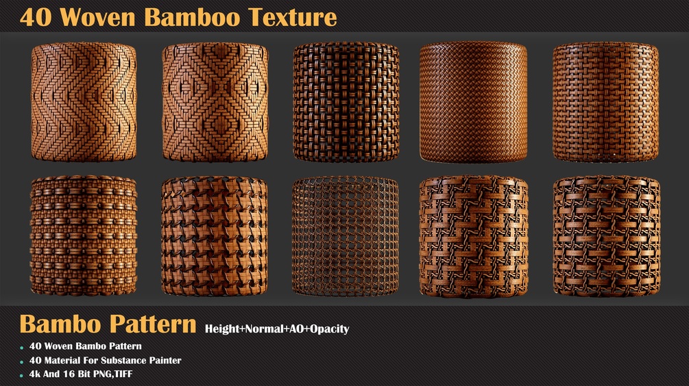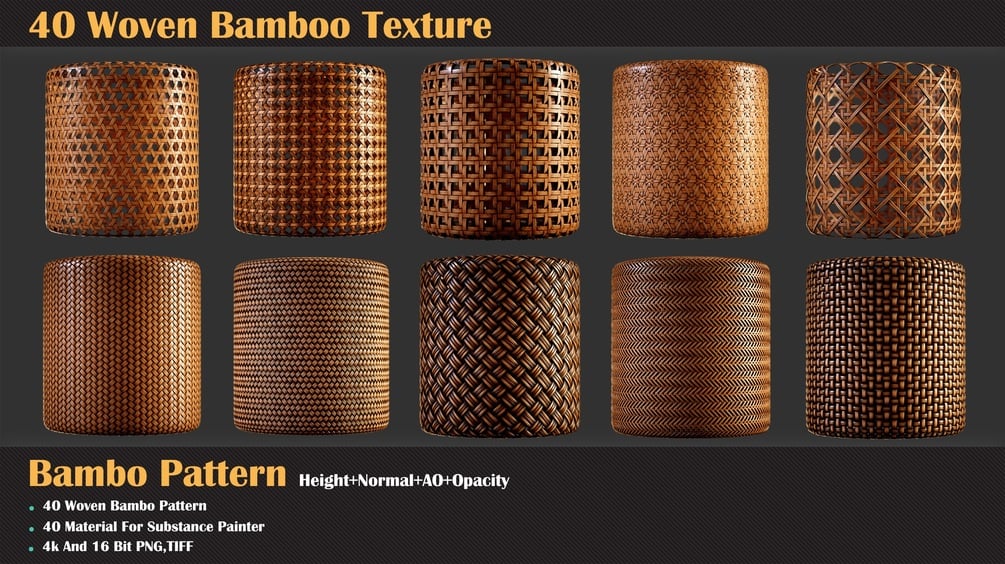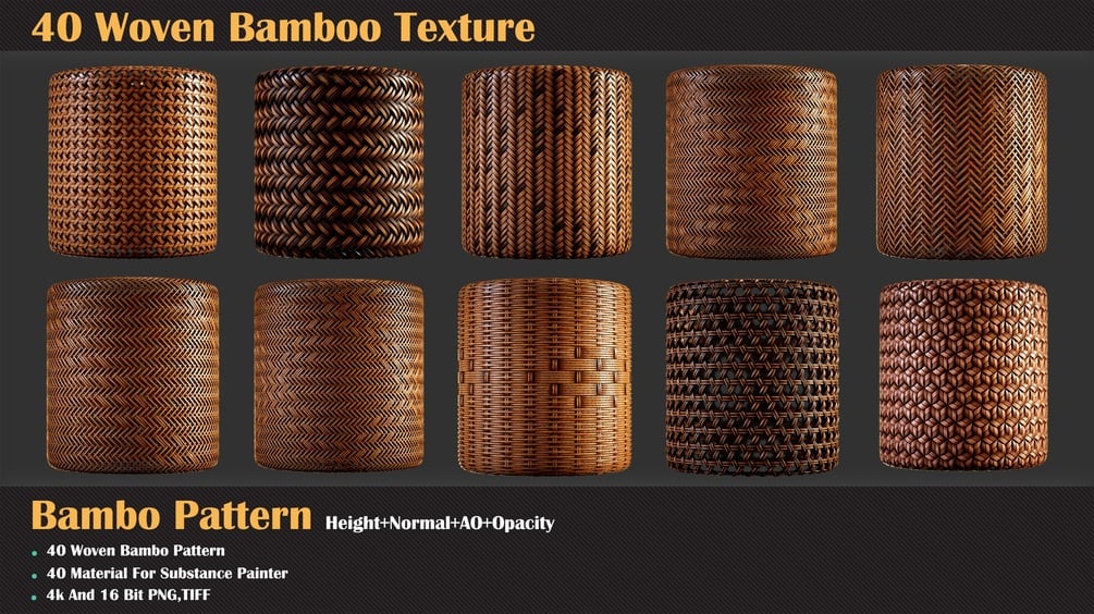 It is a hard time when you reach this step, Creating a woven pattern for your object. In this collection, we put 40 unique and different for you. There are four different texture types height, normal, ambient occlusion, and opacity.