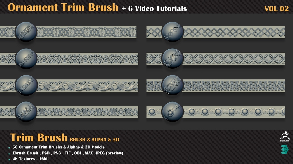 This Product include 50 Ornament Trim Brushs for Zbrush and 50 3dmodels for use any 3d software ( 3dmax,maya,blender,C4D , ... )