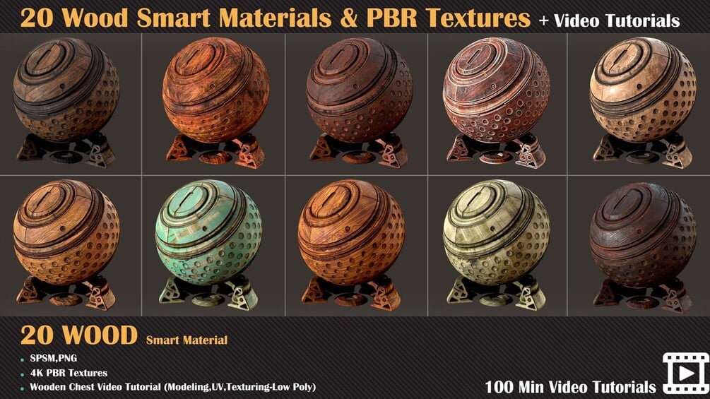 This product includes 20 Wood Smart Material for Substance Painter and 4K PBR texture + Video Tutorials of creating a Treasure Chest Such as modeling, UV, texturing, and Lowpoly. You can use the PBR Textures for any program that works with textures and height maps.info about this Product :