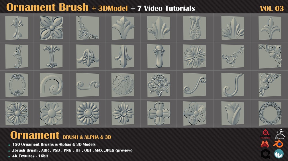 This Product include 150 Ornament alpha/brush set for ZBrush, Substance Painter,Photoshop, Quixel DDO and NDO etc.
