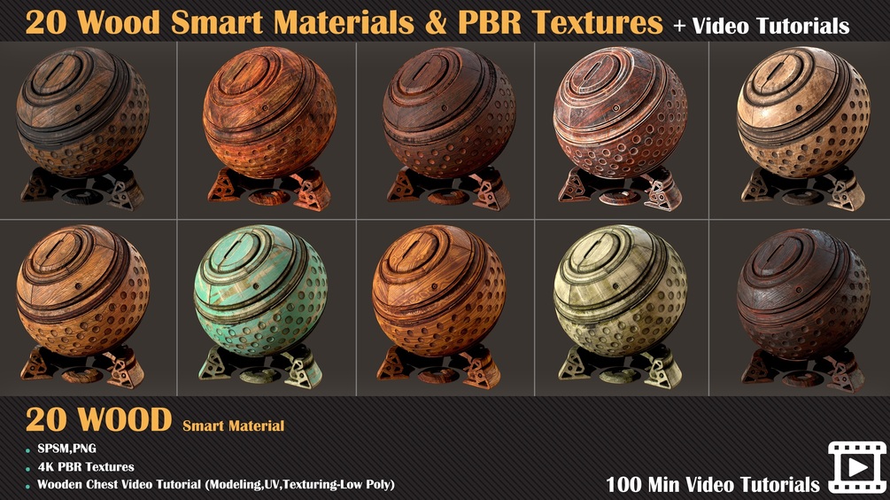 This product includes 20 Wood Smart Material for Substance Painter and 4K PBR texture + Video Tutorials of creating a Treasure Chest Such as modeling, UV, texturing, and Lowpoly. You can use the PBR Textures for any program that works with textures and height maps.